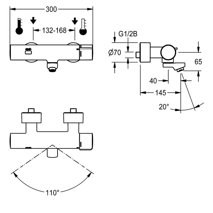 F5E-Therm Termostatická nástěnná baterie DN 15 k montáži na stěnu s aretovatelným otočným vývodem, pro umývárny. Optoelektronicky řízená, spuštění přiblížením dlaně k senzoru. Termostat s kovovou rukojetí s nastavitelným teplotním dorazem s pojistkou proti přetočení. S možností ruční termické dezinfekce. K připojení na teplou a studenou vodu. Řídicí elektronika, kartuše s elektromagnetickým ventilem, lithiová baterie 6 V (CR-P2) a senzor v celokovovém tělese, leštěná chromovaná mosaz. Regulátor laminárního proudění s integrovaným regulátorem průtoku 6,0 l/min. S nastavitelnými a uzavíratelnými přípojkami se zábranou zpětného toku a sítky, zcela zakrytými hloubkově nastavitelnými šroubovacími rozetami. Rozpětí 145 mm. Aktivované hygienické proplachování 24 hodin po posledním použití, bezpečnostní vypnutí při trvalé reflexi a ukládání statistických údajů. S možností nastavení funkčních parametrů a komunikace pomocí volitelného obousměrného dálkového ovládání nebo volitelného C-modulu s nezbytnou aplikací.