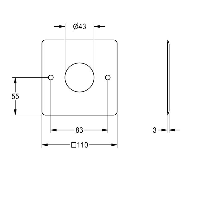 Edelstahlabdeckplatte 110 x 110 mm, mit Bohrung für Fernbetätigungsventil und Dichtungsstreifen.