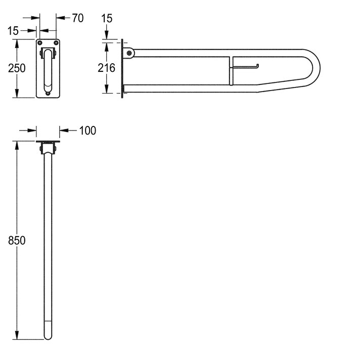 Stützklappgriff mit WC-Rollenhalter für Aufputzmontage, Chromnickelstahl, Oberfläche seidenmatt, Schliff mit rutschhemmender Wirkung, Rohrdurchmesser 32 mm, Wandstärke 1,2 mm, in Bügelform, mit WC-Rollenhalter, Schutz gegen ungewolltes Herunterklappen, Anschlagdämpfer aus Gummi, 4 mm starke Montageplatte mit drei Befestigungslöchern, inklusive Edelstahlschrauben und Dübel. Befestigung nur für Beton-Mauerwerk geeignet.