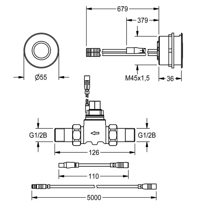 F5E Urinalspülarmatur DN 15 in Kombinationsbauweise für Hinterwandinstallation, opto-elektronisch gesteuert. Mit rundem Sensor (Durchmesser 55 mm), mit integrierter Steuerelektronik und Reinigungsabschaltung, Messing poliert verchromt, von hinten zu verschrauben, mit Verdrehsicherung, Magnetventil mit Verschraubungen G 1/2 B, Verlängerungskabel für Magnetventil, Länge 5 m. Aktivierte Hygienespülung 24 Stunden nach letzter Betätigung und Speicherung von Statistikdaten. Mit Möglichkeit der Parametrierung und Kommunikation über optionale bidirektionale Fernbedienung. Wahlweise für Batteriebetrieb mit 6 V Lithium Batterie (CR-P2) je Armatur oder separate Spannungsversorgung über Netzteil 6,75 V / 12 V DC oder AQUA 3000 open Systemzubehör.
