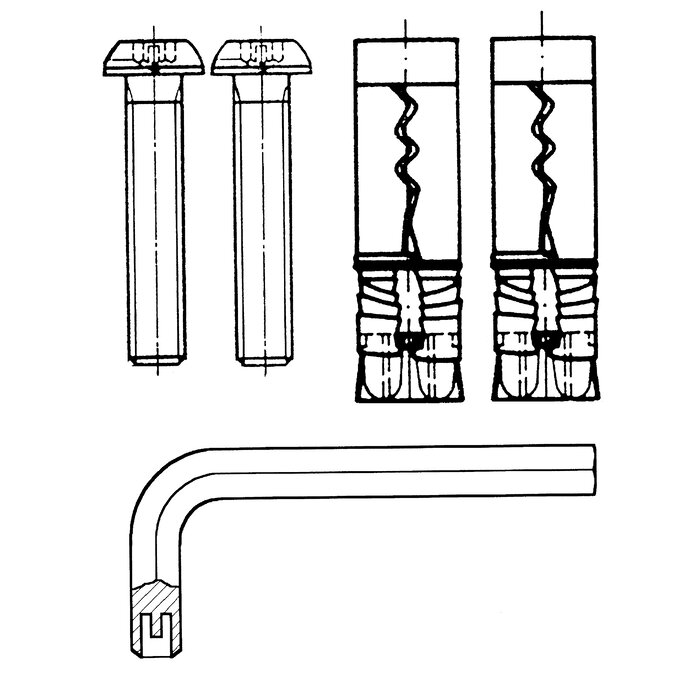 Befestigungssystem HD aus Chromnickelstahl, 2 Sicherungsschrauben, 2 Schwerlastdübel, 1 Schlüssel = Set.