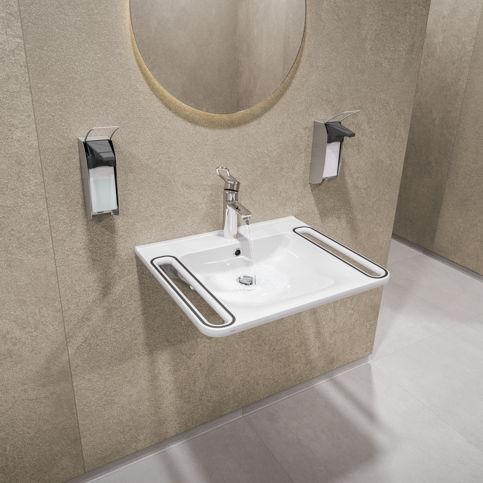 MEDCARE Haltegriff für Wandmontage, für barrierefreie Anforderungen, Chromnickelstahl, Oberfläche Basaltgrau beschichtet, Rohrdurchmesser 32 mm, Materialstärke 1,5 mm, Wandabstand 84 mm, mit Endkappen aus Kunststoff, Befestigung mittels Edelstahlzylindern und Rosetten für verdeckte Montage, inklusive Befestigungsmaterial.