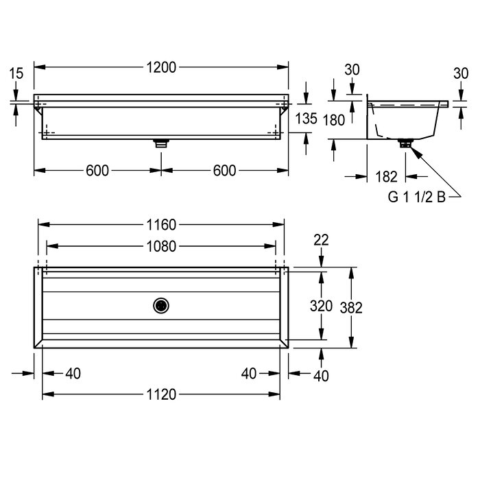 PLANOX fugenlos verschweißte Waschrinne für Wandmontage, Chromnickelstahl, Oberfläche seidenmatt, Materialstärke Waschrinne 0,8 mm / Seitenpaneele 1,2 mm, Seitenpaneele mit integrierten Wandkonsolen, ohne Armaturenbank, ohne Überlauf, 40 mm Wandzarge, Ablauf mittig, Siebventil G 1 1/2 B, inklusive Befestigungsmaterial. Ab einer Länge von 1800 mm ist eine zusätzliche Konsole im Lieferumfang enthalten. Sonderlängen auf Anfrage möglich.