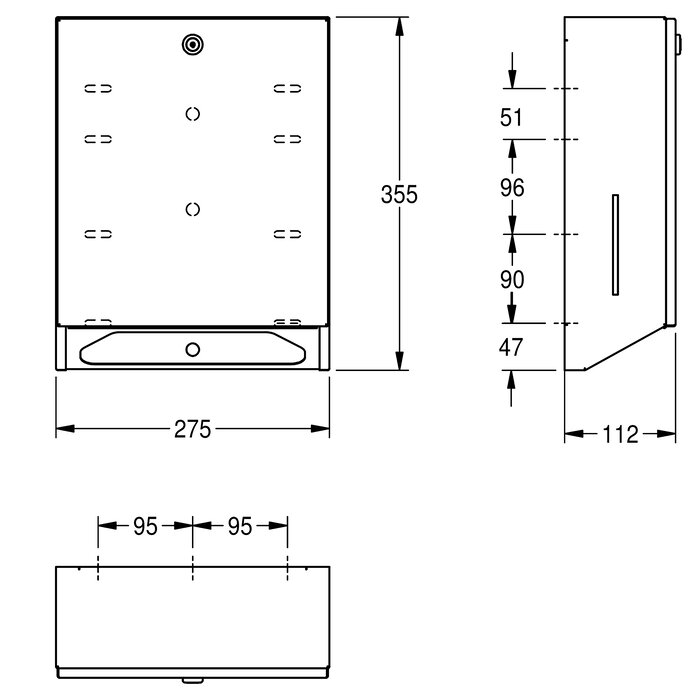 Papierhandtuchspender, für Aufputzmontage, Chromnickelstahl, Oberfläche seidenmatt, Materialstärke 0,8 mm, gekantete Front, seitliche Sichtfenster, Zylinderschloss mit KWC Einheitsschlüssel, Fassungsvermögen 300 - 400 Stück je nach Fabrikat und Faltung, inklusive Edelstahlschrauben und Dübel.