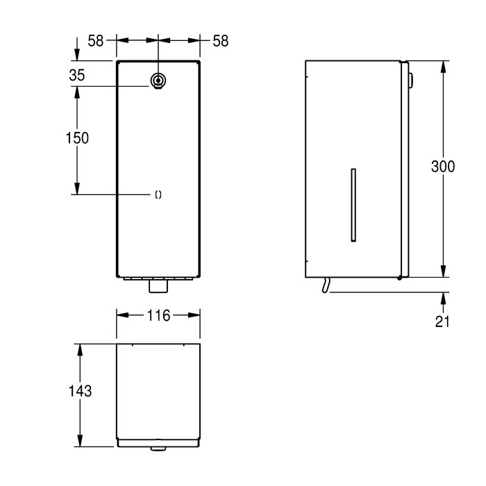 Seifenspender, für Aufputzmontage, Chromnickelstahl, Oberfläche seidenmatt, Materialstärke 0,8 mm, mit Sichtfenstern an den Seiten, gekantete Front, Zylinderschloss mit KWC Einheitsschlüssel, geeignet für Flüssigseife und Lotionen, 0,8 Liter-Nachfüllbehälter, mit Kunststoffzughebel, inklusive Edelstahlschrauben und Dübel.