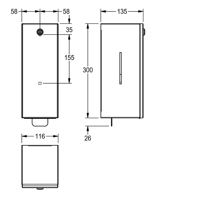 Schaumseifenspender, für Aufputzmontage, Chromnickelstahl, Oberfläche seidenmatt, Materialstärke 0,8 mm, mit Sichtfenstern an den Seiten, Zylinderschloss mit KWC Einheitsschlüssel, geeignet für KWC Schaumseife, Edelstahlzughebel, inklusive Edelstahlschrauben und Dübel.