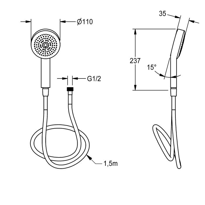 Handbrause aus Kunststoff verchromt mit Regenstrahl, eine Strahlart, Durchmesser 110 mm, aerosolarm mit Antikalk-System. Inklusive nylonverstärktem Brauseschlauch in Chromfarbe. Mit verdrehbarem konischem Handbrauseanschluss G 1/2 und gerändeltem Armaturenanschluss G 1/2, Länge 1500 mm. Wasserführende Bauteile aus entzinkungsbeständigem Messing, konform der EU-Positivliste.