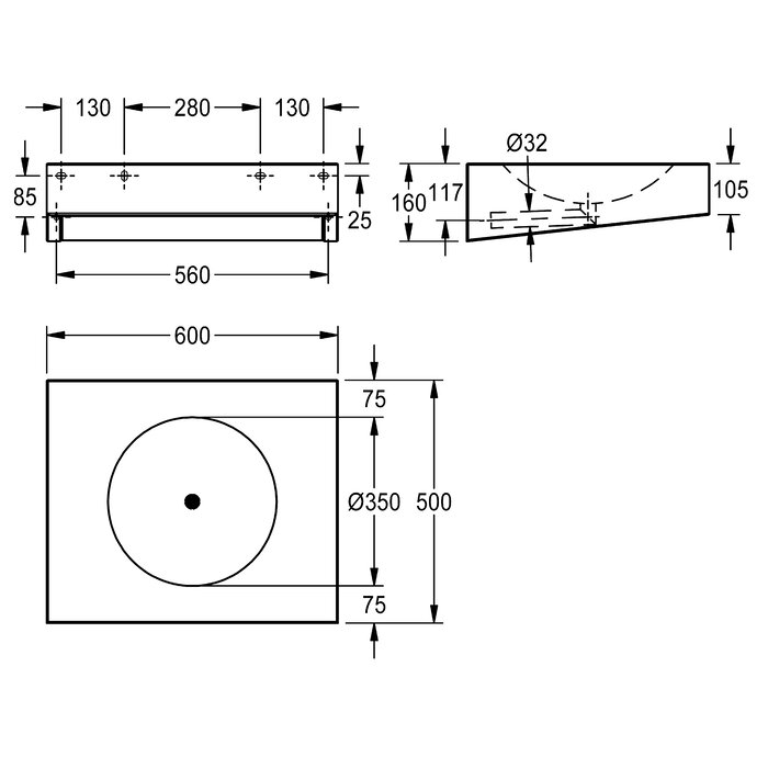Einzelwaschtisch, für Wandmontage, Chromnickelstahl, Oberfläche seidenmatt, Materialstärke 1,2 mm, fugenlos eingeschweißtes Rundbecken, mit Armaturenbank 75 mm (T), ohne Armaturenbohrung, ohne Überlauf, mit fugenlos eingeschweißtem Siebventil G 1 1/4 B und Abgangsrohr DN 32, Unterputzsiphon bauseits, Waschtisch unten geschlossen mit Revisionsklappe, integrierte Konsolen für Montage mit Stichmaß 280 mm gemäß EN 31, inklusive Edelstahlschrauben und Dübel.