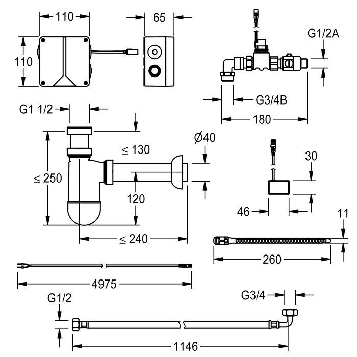 Elektronische Siphonsteuerung zur unsichtbaren Installation für die berührungslose Spülung von KWC Reihenurinalen aus Edelstahl. Mit Anschlussschläuchen, Magnetventil, Siphon mit außen montiertem Sensor ohne Wasserkontakt und Elektronikbox inklusive Netzteil und Steuerung mit verlängerter Sperrzeit, 230V AC.