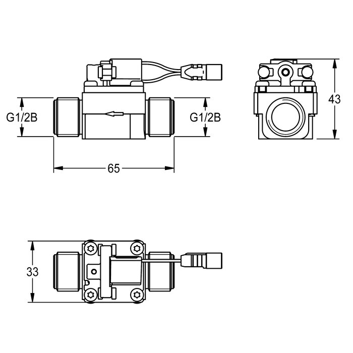 Magnetventil DN 7, Anschlüsse beidseitig G 1/2 B, bistabil, mit wasserdichtem Stecker, 6 V DC.