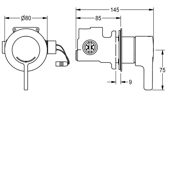 F5L-Therm Funktionsblock DN 15 mit integrierter Mischkartusche, Magnetventilkartusche für Hygienespülung und Rückflussverhinderer. Mit Hebelkappe, Rosette und verdeckter Schraubbefestigung.
