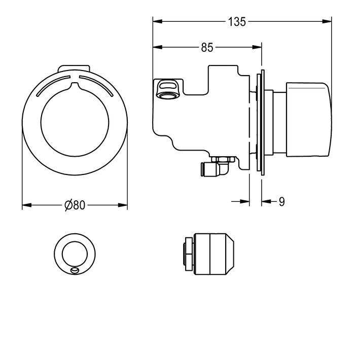 F5S-Mix Selbstschluss-Eingriffmischer DN 15 mit FRAMIC Selbstschluss-Mischkartusche, mit Griffdruckkappe, Rosette und verdeckter Schraubbefestigung. Für automatische Brauserohrentleerung.