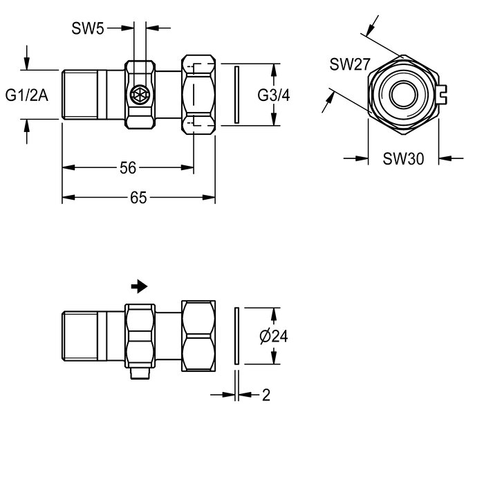 Wassermengenregulierung DN15 mit Überwurfmutter G3/4.