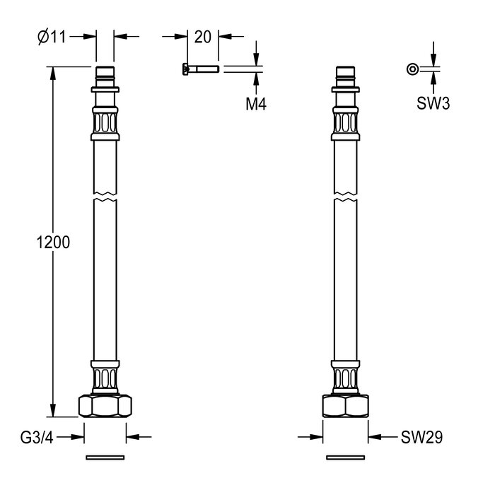 Anschlussschlauch DN 10, Steckfitting Durchmesser 11 mm x G3/4, Länge 1200 mm.