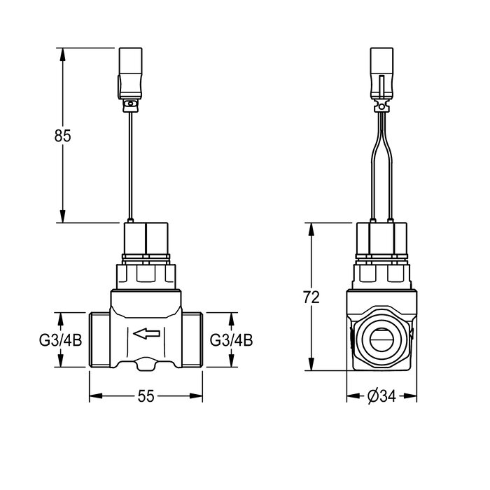 Magnetventil, Anschlüsse beidseitig G 3/4 B, monostabil, mit wasserdichtem Stecker und Sieb, 24 V DC.