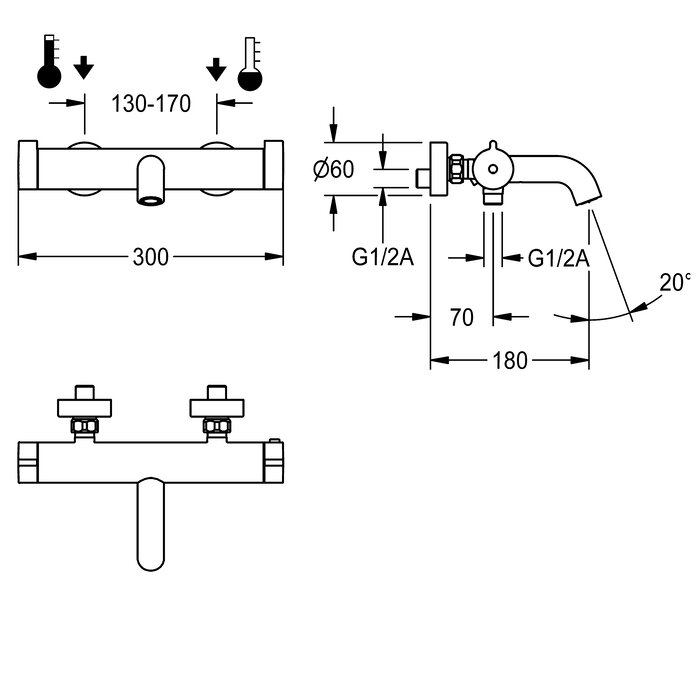 F4MT-Med Thermostat-Wannenbatterie mit feststehendem Auslauf als 2-Griff-Wandbatterie DN 15, Armaturengruppe I, zur Aufputzmontage für Bäder im Gesundheitswesen und Pflegebereich, zum Anschluss an Warm- und Kaltwasser. Keramische Ventilkartusche mit Drehgriff für Mengenregulierung, Mischwasserabsperrung sowie integrierter Wanne- und Handbrause-Umstellung. Thermostatisch gesteuerte Mischkartusche mit Dehnstoffelement und aktivem Verbrühungsschutz, eigensicher gegen Rückfließen sowie einstellbarem und verdrehsicherem Temperaturanschlag, voreingestellt auf 38 °C und Möglichkeit zur Durchführung einer manuellen thermischen Desinfektion. Reinigungsoptimierte Armaturenform mit ergonomisch gestalteten Griffen, verbrühungssicheres Safe-Touch-Gehäuse mit Handbrauseanschluss 13 l/min, G 1/2 B, Wannenauslauf mit Laminarstrahlregler 20 l/min und Rückflussverhinderern. Ganzmetallausführung, poliert verchromt. Zweischaliges Armaturengehäuse zur Reduzierung der Wärmeübertragung vom Armaturengehäuse auf die Kaltwasserleitung, mit volumenreduzierten und glatten Wasserführungen. Mit verstellbaren Anschlüssen mit Sieben und Schraubrosetten. Ausladung Wannenauslauf 180 mm.