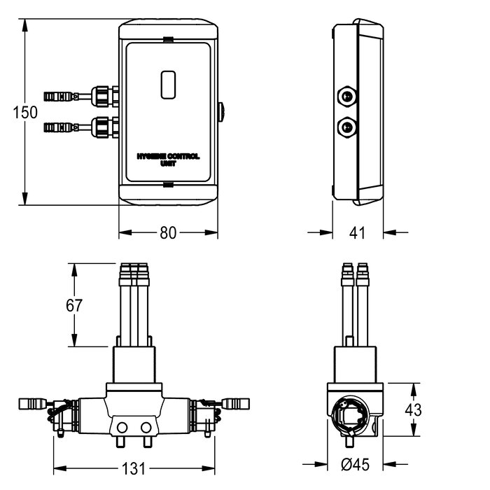 Hygieneeinheit für F5L Einhebelmischer, Ausladung 125 mm, zur Durchführung einer automatischen Hygienespülung und programmgesteuerten thermischen Desinfektion. Funktionsblock mit 2 Magnetventilkartuschen und elektronischer Steuereinheit im Gehäuse aus Kunststoff zur Aufputzmontage, für Batterie- oder Netzbetrieb, 6 V DC.