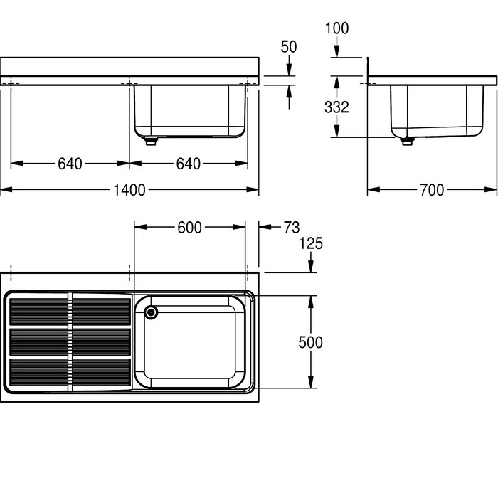 Gewerbespüle, optional montierbar als Auflagespüle (Untergestell) oder für Wandmontage (Konsolen), Chromnickelstahl, Oberfläche seidenmatt, Materialstärke 1,0 mm, Becken rechts fugenlos eingeschweißt, G 1 1/2 B Ventilkörper und 2-teiligem Überlauf-Standrohr, umlaufender Schwallrand, Armaturenbank 100 mm (T), fugenlose Rückwand als Spritzschutz 100 mm (H), verstärkte Abtropffläche links, mit Riffelung und Schwallrand zum Becken geneigt, inklusive vorgefertigter Befestigungspunkte / Lochbohrungen für Untergestell / Konsolen.
