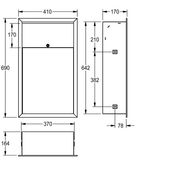 Abfallbehälter, für Unterputzmontage, Chromnickelstahl, Oberfläche seidenmatt, Materialstärke 0,8 mm, Oberkanten gesäumt, Zylinderschloss mit KWC Einheitschlüssel, Montage mit Unterputzrahmen, Fassungsvermögen zirka 23 Liter, inklusive Edelstahlschrauben und Dübel.