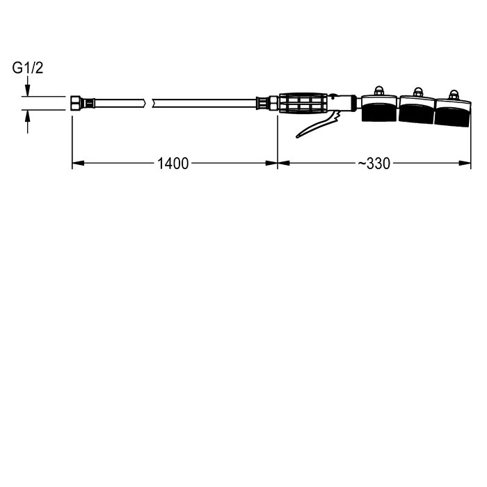 Handbürste mit Hebelventil, Sprührohr mit 3 getrennt montierten Bürsten-Elementen, mit Anschlussschlauch DN 8, G 1/2, Länge 1400 mm und Verdrehsicherung.