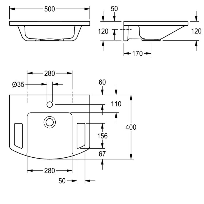 EXOS. hand washbasin made of MIRANIT resin-bonded mineral material with pore-free smooth surface (temperature-resistant up to 80 °C), Alpine white colour. Roll-under, with integrated grab rails, storage areas, seamless moulded bowl, without overflow, with tap hole 35 mm (D). Mounting on washbasin back panel, including mounting material.