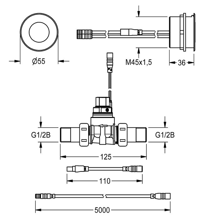 F5E Urinal flush valve DN 15 for concealed mounting, opto-electronic control. With round sensor (diameter 55 mm), with integrated control electronics and deactivation of cleaning, high-polished chrome-plated brass, to be screwed in from rear, with anti-twist protection, solenoid valve with screw fixings G 1/2 B, extension cable for solenoid valve, length 5 m. Activated water hygiene flushing 24 hours after last activation and saving of statistical data. With option for parameterization and communication via optional, bidirectional remote control. Optional for battery operation with 6 V lithium battery (CR-P2) per fitting or separate power supply via power supply unit 6.75 V/12 V DC or AQUA 3000 open system accessories.
