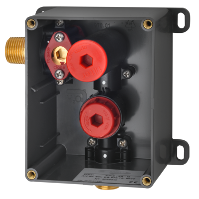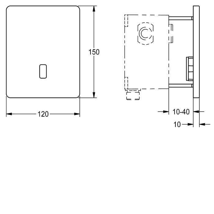 F5E urinal flush valve DN 15 and installation kit for in-wall installation with basic installation kit, opto-electronically controlled. With self-closing solenoid valve cartridge, holding frame, stainless steel cover plate 120 x 150 mm with covered screw fixing including sensor with control electronics and strainer. Activated water hygiene flushing 24 hours after last activation and saving of statistical data. With option for parametrisation and communication via optional, bidirectional remote control. Option for battery operation with 6 V lithium battery (CR-P2) per fitting or separate power supply via power supply unit 6.75 V/12 V DC or AQUA 3000 open system accessories.