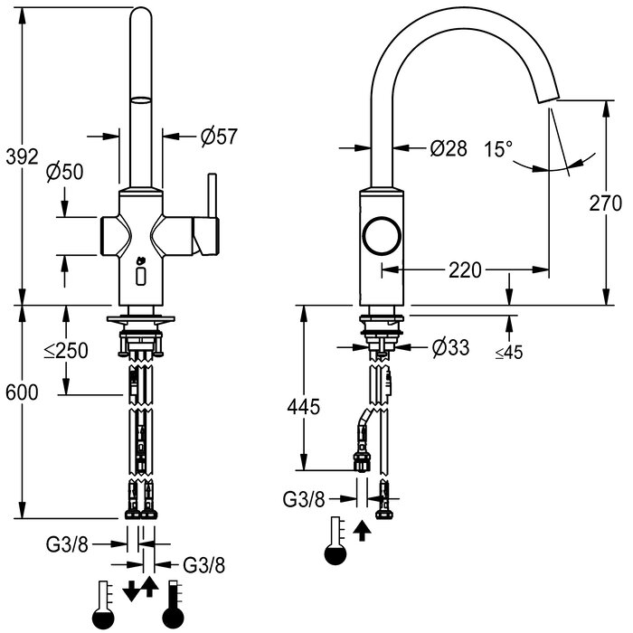F5LME hybrid kitchen fitting DN 15 as pillar mixer with swivelling spout, can be locked in the centre position. Adjustable swivel ranges of 50°, 120° and 360°. To the connection via hoses in open undercounter boilers. Single lever mixer with mixer cartridge with ceramic disc technology and adjustable, turn-proof temperature stop. Alternative activation using hand reflection via an opto-electronic sensor for time-controlled water release with preset mixing water temperature. Mixer cartridge, solenoid valve and sensor with control electronics in all-metal housing, brushed stainless steel. With beam shaper. Projection 220 mm. Activated water hygiene flushing 24 hours after last activation, safety switch-off for continuous reflection and saving of statistical data. With option for parametrisation and communication via optional, bidirectional remote control. Optionally for battery operation with battery compartment including 6 V lithium battery (CR-P2) per fitting for installation under the kitchen sink or for separate power supply via 6.75 V/12 V DC power supply unit or AQUA 3000 open system accessories.