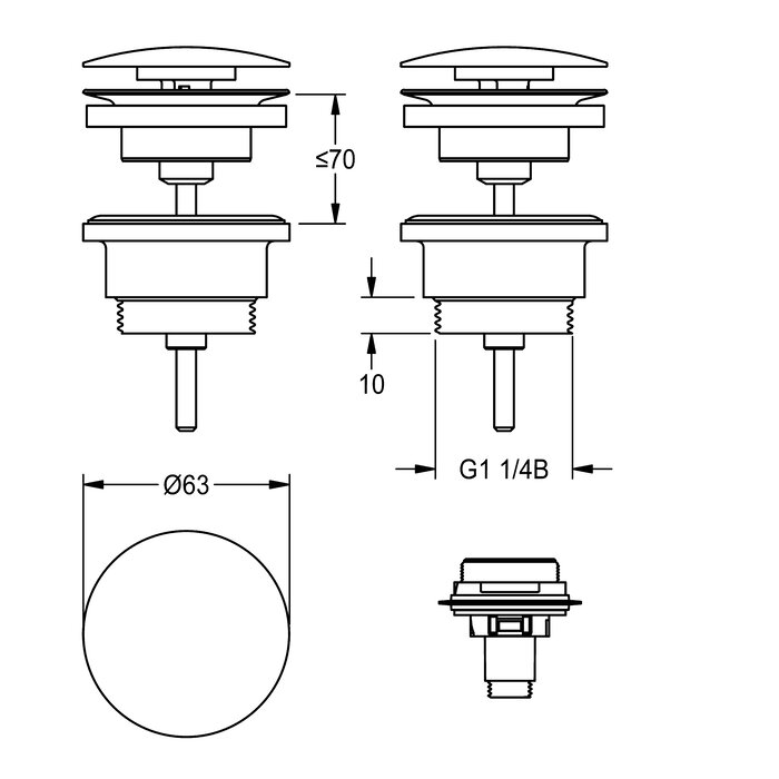 Dome waste valve, shaft valve and dome made of stainless steel, including an adapter for retrofitting on click closing dome, connection G 1 1/4 B.