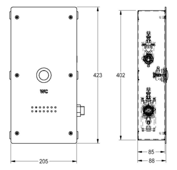 WC flushing system with bidet flush valve for installation in walls with enhanced safety in applications with an impending risk of vandalism, e.g. in prisons, has stainless steel cover plate SS304L grade, includes flush valve DN 20 for WC and flush valve DN 15 for Bidet, 1pc remote control, mounting box and basic installation kit for in-wall mounting consisting of countersunk security screws and dowels.