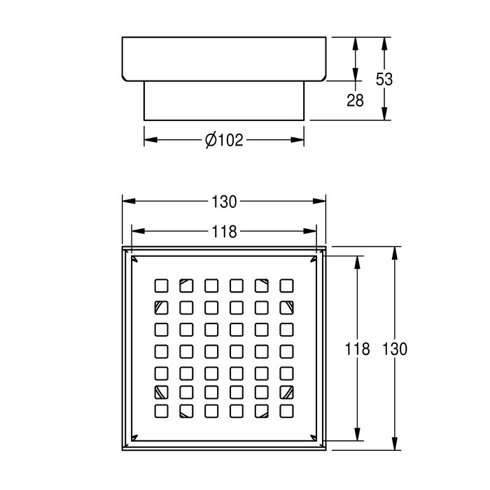 Square Drain 130mmSQ with grated cover made of stainless steel 304L (EN 1.4307), surface satin finished, material thickness of 2.0 mm, with 102mmØ (4") outlet.