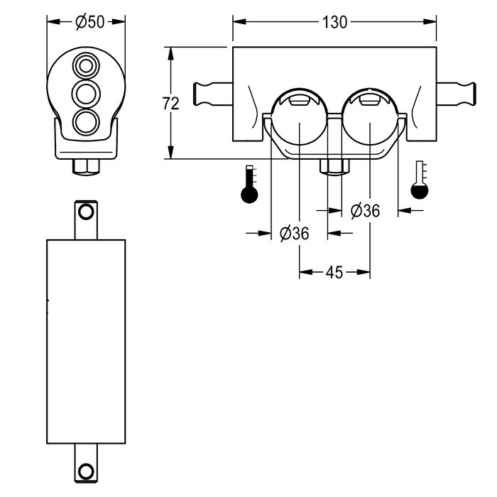 agua superpuestas, para montaje en líneas de distribución adyacentes, distancia entre centros de 45 mm.