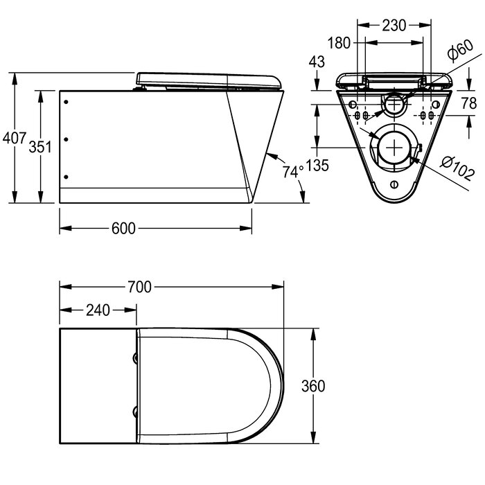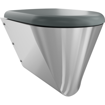 Inodoro suspendido a pared para minusvalía sin tapa, descarga en fondo, acero de cromo-niquel, superficies visibles satinadas, espesor de material 1,5 mm, descarga certificada según EN997 de mín. 4 litros de agua y salida horizontal a pared con antiolor en acero inoxidable DN100, superficie de asiento con estrechamiento hacia dentro, redondeado por todos lados, antivandálico, fijación con pletina incluida según EN 33 y tornillería de seguridad. con asiento de inodoro blanco