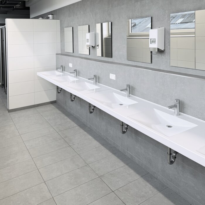 El innovador sistema de descarga de urinarios F5 garantiza la limpieza de los urinarios. Con la ayuda de un control centralizado de la sala, el sensor montado en el techo limpia automáticamente los urinarios después de cada uso.