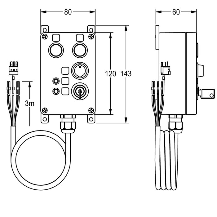Caja de control para entradas y salidas digitales del controlador de función ECC2. Accionamiento e indicación mediante teclas, interruptores y luces LED. Carcasas para instalación en superficies de plástico, con cable de conexión y llaves, 24 V DC.