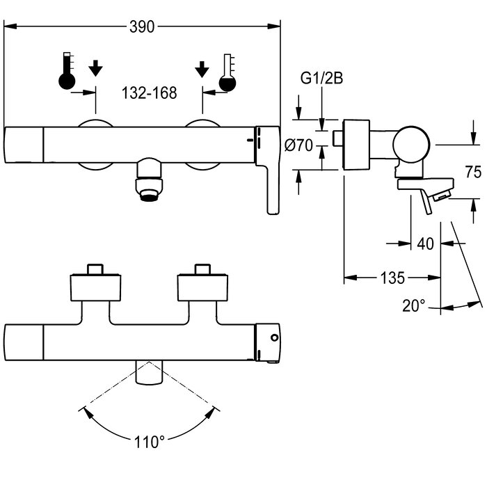 F5L-Therm-vipusekoitin termostaatilla, seinähana DN 15, pinta-asennukseen, lukittava kääntösäde, pesualtaisiin. Termostaattiohjattu sekoituslaite laajennuselementillä ja aktiivisella palovammasuojauksella sekä säädettävä, tahattomalta kääntämiseltä suojattu lämpötilanrajoin ja keraaminen kiekkotekniikka. Esiasennettu hygieniayksikkö ja C-moduuli, ohjauselektroniikka ja 6 V:n litiumparisto (CR-P2) ja magneettiventtiili automaattiseen hygieniahuuhteluun sekä tilastotietojen tallennukseen. Liitetään lämpimään ja kylmään veteen. Palovammaturvallinen messinkinen Safe-Touch -runko, kotelo kromattu ja kiillotettu. Hanan rungosta irralliset, ohuet sileät vesijohdot ovat messinkiä eikä niissä ole nikkelipinnoitetta. Termiset eristerakenneosat lämmönsiirron vähentämiseksi hanan rungosta kylmävesijohtoon. Pyörteetön virtaaman säädin integroidulla virtaaman säätimellä 6,0 l/min. Varustettu säädettävillä ja lukittavilla takaisinvirtauksen estävillä liittimillä ja sihdeillä, kokonaan peitetty kierrettävillä peitelevyillä, joiden syvyys on asetettavissa. Ulkonema 135 mm. Hygieniahuuhtelu aktivoituu 24 tunnin välein. Mahdollisuus radio-ohjattuun parametrointiin, tilastotietojen lukemiseen, ennalta määriteltyjen kalenteritoimintojen toteuttamiseen sekä hanojen ryhmittelyyn, jotta ne voivat suorittaa ennalta määriteltyjä ohjaustoimintoja tarvittavan sovelluksen kautta.