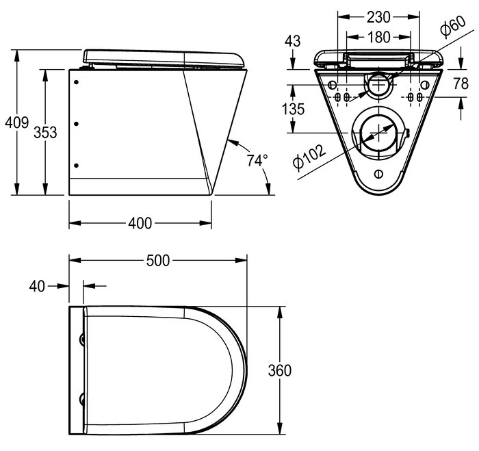WC suspendu en acier inoxydable, surfaces visibles en finition satinée, épaisseur du matériau 1,5 mm, chasse d'eau certifiée conforme à EN 997, mécanisme de chasse dissimulé avec capacité minimum de 4 litres, évacuation horizontale avec siphon DN 100 en acier inoxydable, siège incurvé vers le centre, bords arrondis, fixation avec plaque de montage fournie, conforme à EN 33, vis de sécurité fournies.