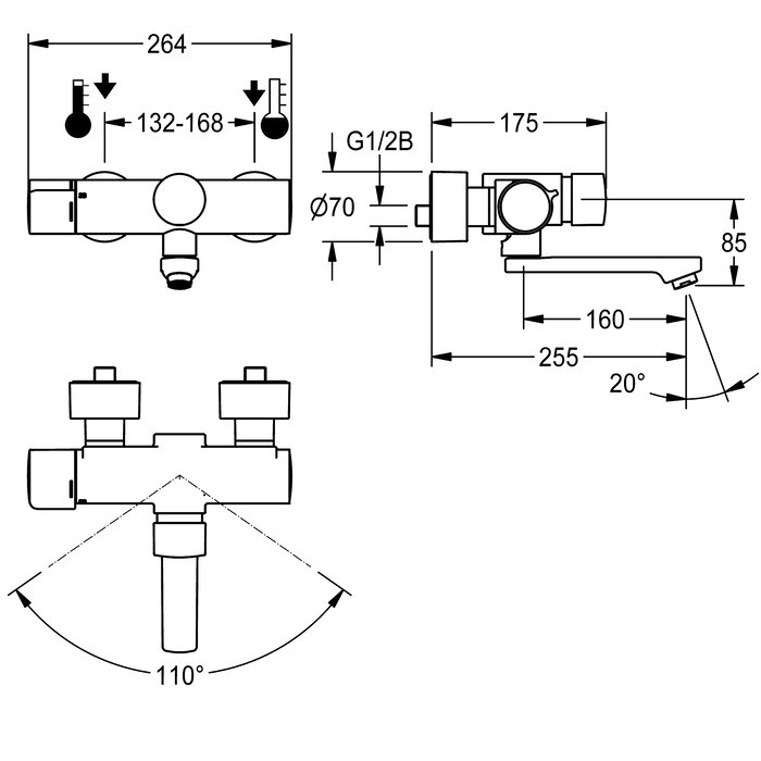Mitigeur thermostatique mural à fermeture automatique F5S-Therm DN 15 pour le montage en saillie avec sortie pivotante bloquante, pour les installations sanitaires. À commande hydraulique, pour le raccordement sur les arrivées d'eau chaude et d'eau froide. Avec dispositif pour l'unité hygiénique en option avec module C pour l'exécution d'un rinçage hygiénique automatique et d'une lecture de données statistiques. Cartouche à fermeture automatique FRAMIC, à commande hydraulique, nécessitant peu de maintenance et sans stagnation, avec technologie à disques de céramique, fermant automatiquement, indépendante de la pression de débit grâce à la conception à fluides séparés. Durée d'écoulement réglable en continu. Thermostat avec poignée métallique à butée de température réglable, avec possibilité de réalisation d’une désinfection thermique manuelle. Boîtier Safe-Touch anti-brûlure, structure entièrement métallique, laiton chromé poli. Mousseur à jet laminaire avec régulateur de débit intégré de 6,0 l/min. Avec raccordements ajustables et bloquants à clapets anti-retour et filtres, entièrement recouverts par des rosaces à visser réglables en profondeur. Projection de 255 mm.