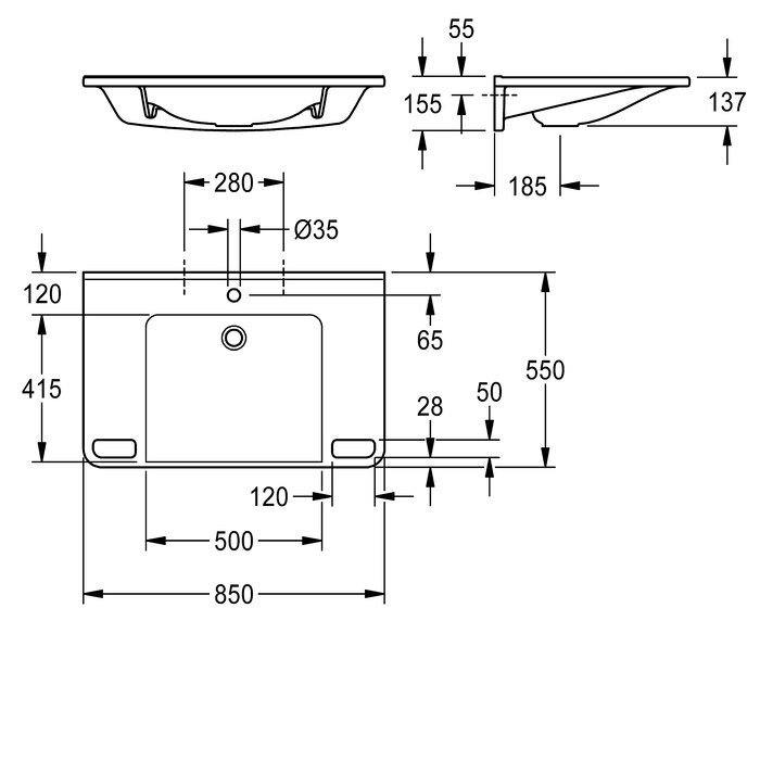 Dimensions 850 x 150 x 550 mm (L x H x P)