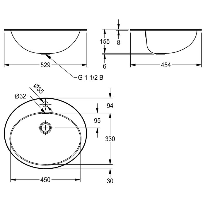 Vasque ovale RONDO, peut être montée comme vasque à encastrer ou vasque sous plan, en inox, surface intérieure et extérieure satinée, épaisseur du matériau 1,0 mm, trop-plein, vidage et trop-plein G 1 1/2 B avec panier pour bonde, plage de robinetterie 94 mm (P) avec perçage pour robinetterie 35 mm (diamètre), étrier en inox pour montage par le bas inclus.