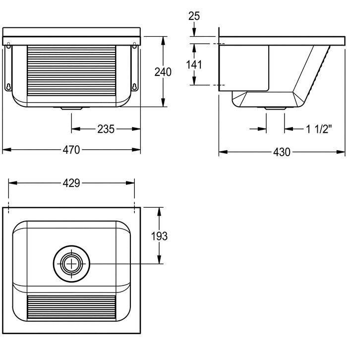 Évier à usage universel, conçu pour une installation murale, en inox, finition satinée, épaisseur du matériau de 0,8 mm, panneau frontal nervuré, bonde à bouchon 1 1/2" centrée, avec trop-plein, remontée arrière de 30 mm, supports de montage pré-soudés. Vis en inox et chevilles fournies.