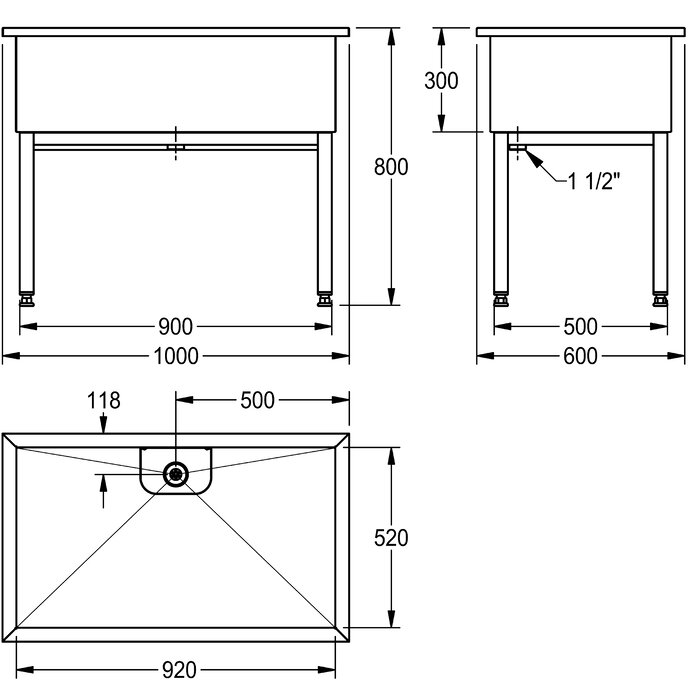 Évier d'atelier, acier inoxydable, finition satinée, épaisseur du matériau 1,2 mm, raccord d'évacuation 38 mm avec tube de trop-plein vertical 1 1/2" et filtre, avec châssis à tubes rectangulaires en inox, réglable en hauteur.