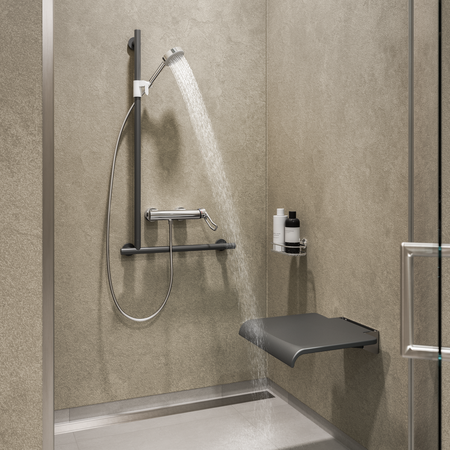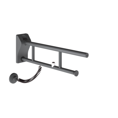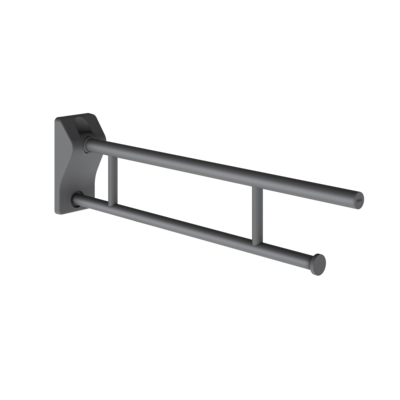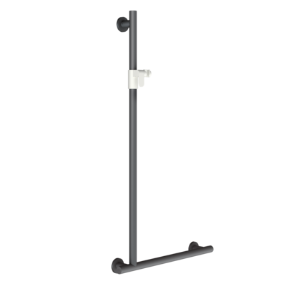 I maniglioni e i corrimano in grigio basalto convincono per la gradevolezza al tatto e il diametro ergonomico di facile impugnatura da 32 mm. Oltre ai corrimano disponibili in diverse lunghezze, il programma prevede anche un corrimano angolare di 90° e maniglioni ribaltabili per WC. Nel corrimano angolare con supporto per doccetta manuale e nel maniglione ribaltabile con pulsante di scarico, i componenti funzionali in bianco offrono un orientamento visivo per gli utilizzatori secondo il collaudato principio dei due sensi.