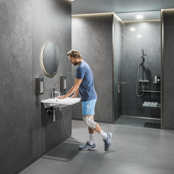 Quando si lavano, molti pazienti in cliniche e strutture di cura desiderano essere autonomi, senza chiedere aiuto al personale addetto. Le dotazioni dei bagni dovrebbero essere adatte a soddisfare queste esigenze. I lavabi MEDCARE, studiati appositamente per bagni privi di barriere architettoniche, tengono conto delle necessità delle persone con disabilità fisiche e visive. Il design dalle linee morbide e slanciate dei nuovi lavabi