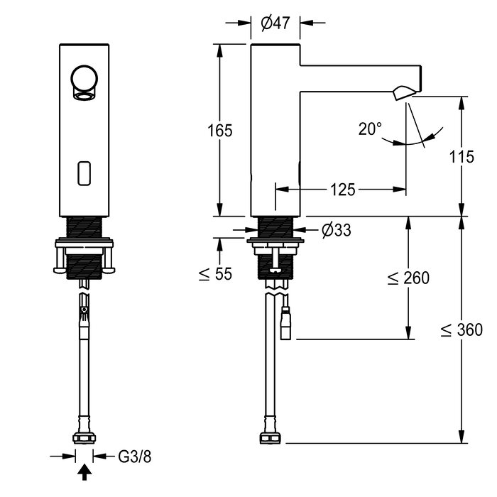 F7E Rubinetto a bordo lavabo DN 15 per bagno, a comando opto-elettronico. Per il collegamento ad acqua fredda o ad acqua premiscelata mediante tubo flessibile e filtro. Elettronica di comando, elettrovalvola e sensore nel corpo in acciaio inox con superficie satinata, altezza bocca di erogazione 115 mm e proiezione 125 mm. Aeratore a regolazione angolare e antifurto, portata 5,7 l/min. Attivazione flussaggio sanitario 24 ore dopo l’ultimo utilizzo, blocco di sicurezza in caso di riflessione permanente e memorizzazione di dati statistici. Con possibilità di parametrizzazione e comunicazione tramite telecomando bidirezionale opzionale o modulo C opzionale con app necessaria. Opzione di funzionamento a batteria con alloggiamento batteria comprensivo di batteria al litio da 6 V (CR-P2), per il montaggio al di sotto del lavabo o per alimentazione separata tramite alimentatore 6,75 V / 12 V DC o accessori di sistema AQUA 3000 open.