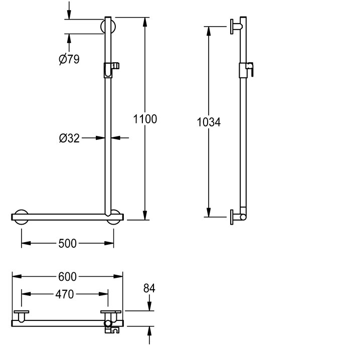 Corrimano angolare MEDCARE 90° con supporto doccetta, per montaggio a parete, acciaio al nichel-cromo, superficie rivestita in grigio basalto, diametro tubo 32 mm, spessore materiale 1,5 mm, distanza dalla parete 84 mm, con tappi terminali in plastica, fissaggio tramite viti in acciaio inox e rosette per montaggio nascosto, dotato di supporto doccetta in plastica, colore bianco alpino, materiale di fissaggio incluso.