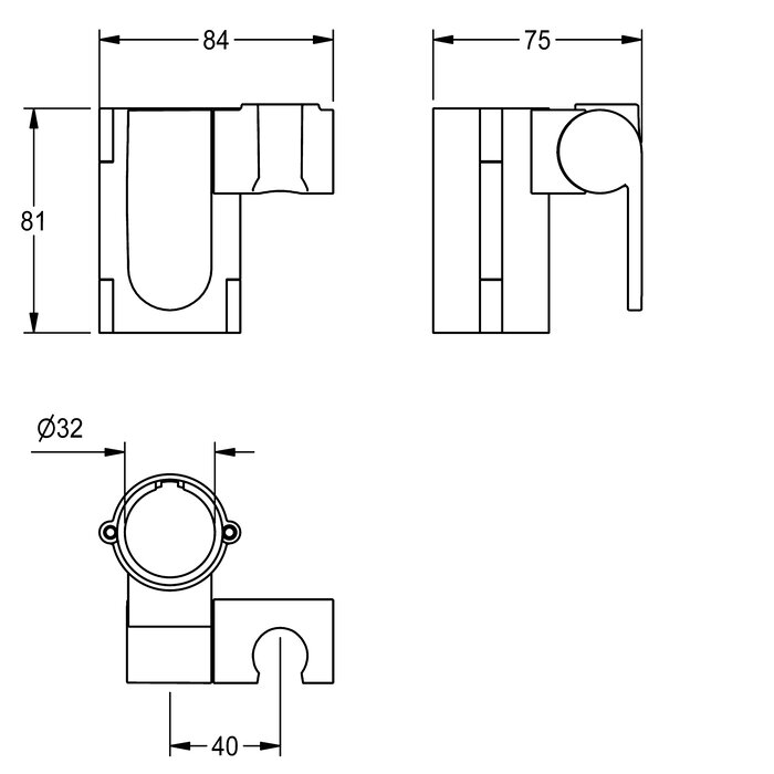 Shower head holder made of plastic, colour alpine white, for mounting on grab rails with 32 mm diameter.