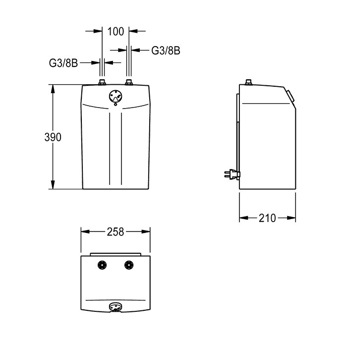 Boiler per installazione sottopiano, 5 litri, con selezione della temperatura, protezione contro il funzionamento a secco, spegnimento e sistema antigelo automatico, spia di segnalazione, cavo di collegamento 50 cm con connettore angolare. Testato e protetto contro gli spruzzi d'acqua in conformità a VDE. Colore bianco. Alimentazione 230 V AC, 50/60 Hz, potenza max 2 kW, protezione IP 24.