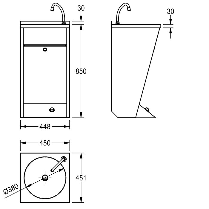 Lavabo con comando a pedale, installazione a parete, in acciaio inox 18/10, superficie satinata, spessore: 1 mm. Vasca rotonda diametro 380 mm con piano rubinetteria. Senza troppopieno, piletta con filtro in acciaio G 1 1/4, inclusa bocca di erogazione, comando azionabile con il piede, premiscelatore. Coperchio frontale asportabile.Inclusi viti e tasselli di fissaggio.