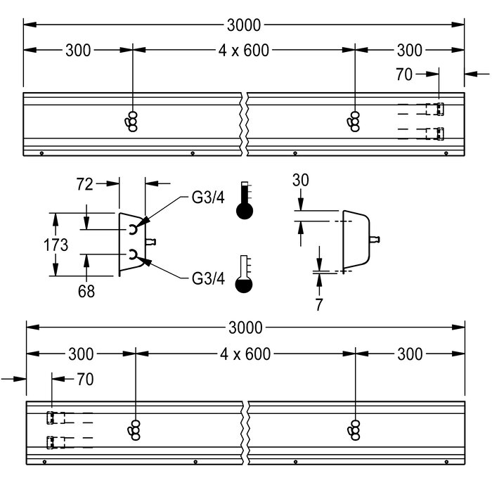 Afmetingen behuizing 3000 x 173 x 72 mm (B x H x D)